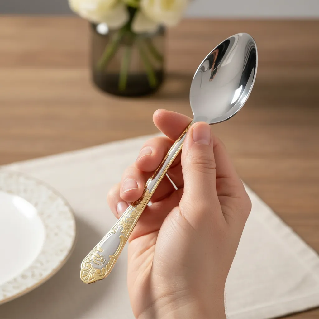 No uso diário, a presença desses talheres adiciona um toque de classe às refeições comuns. Seja um jantar em casa ou uma ocasião especial, a experiência é enriquecida pelo design elegante e pelo peso equilibrado das peças. É notável como os detalhes em ouro capturam a luz e criam um ambiente acolhedor e refinado.